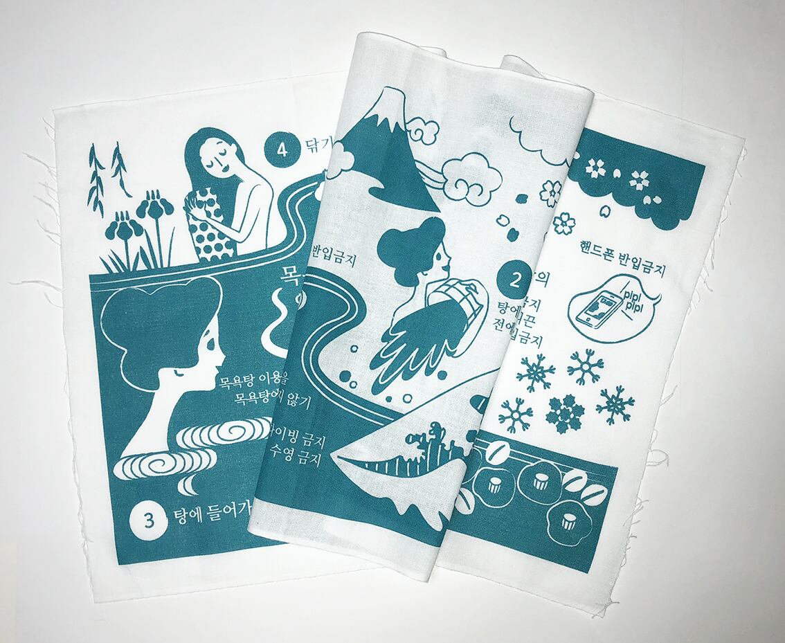 ★京都デザイン賞2017入選★ “お風呂の入り方”手ぬぐいの日本語・英語・中国語・韓国語ver.の1枚ずつセットです。(3,200円/税抜)※手作りのため画像と色が違う場合があります。ご了承ください。